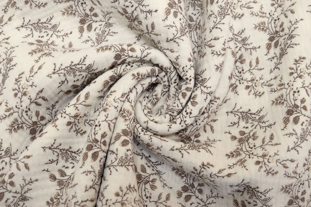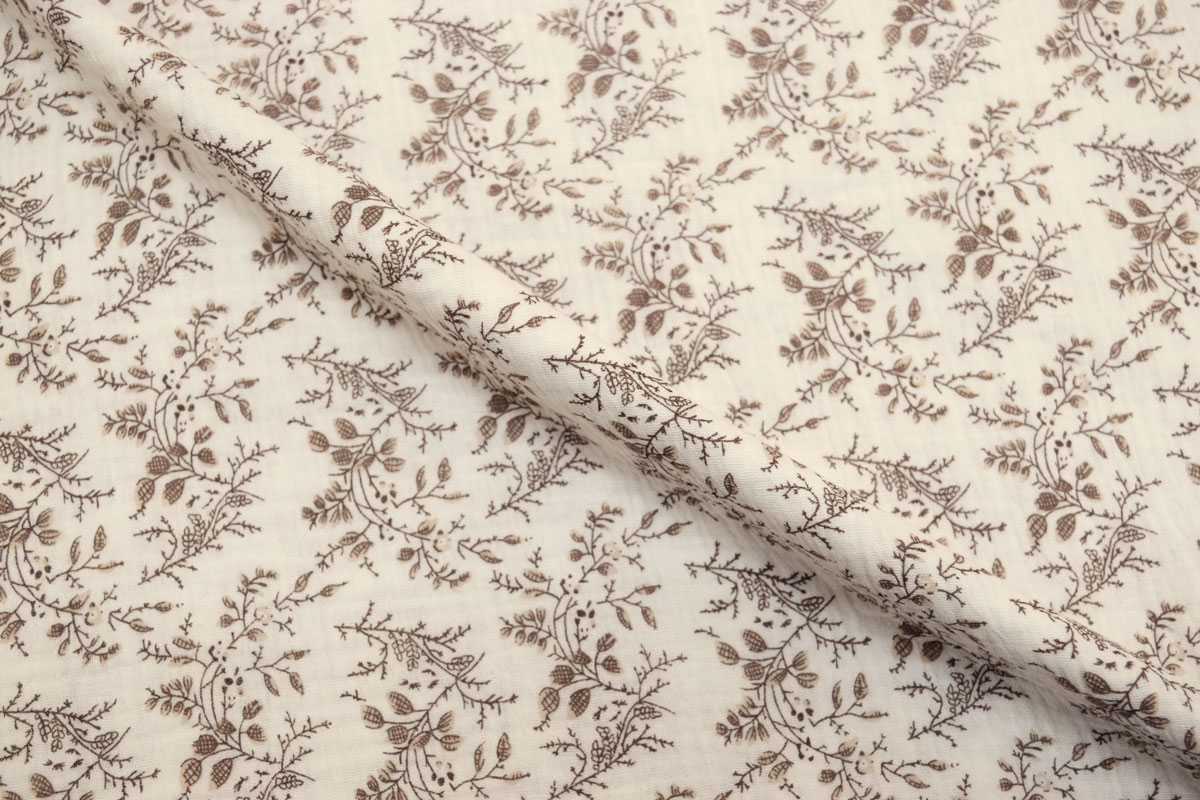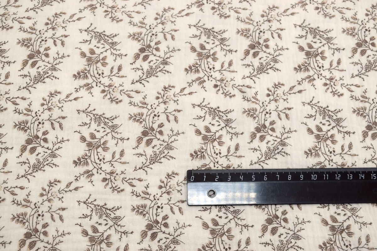 Благодаря плотности 120 г/м2 и ширине 135 см ткань удобно кроится, красиво струится и создает элегантный силуэт, подчеркивая женственность изделий. Бежевый цвет и Листья рисунок позволяют создавать стильные и актуальные модели для повседневного и делового гардероба.