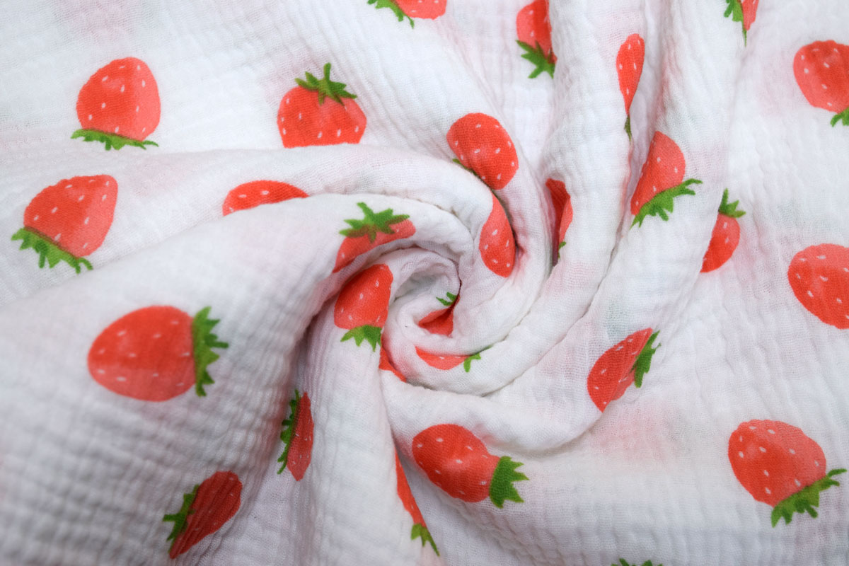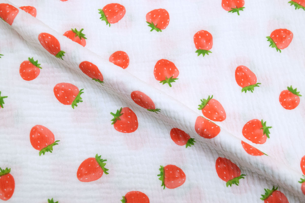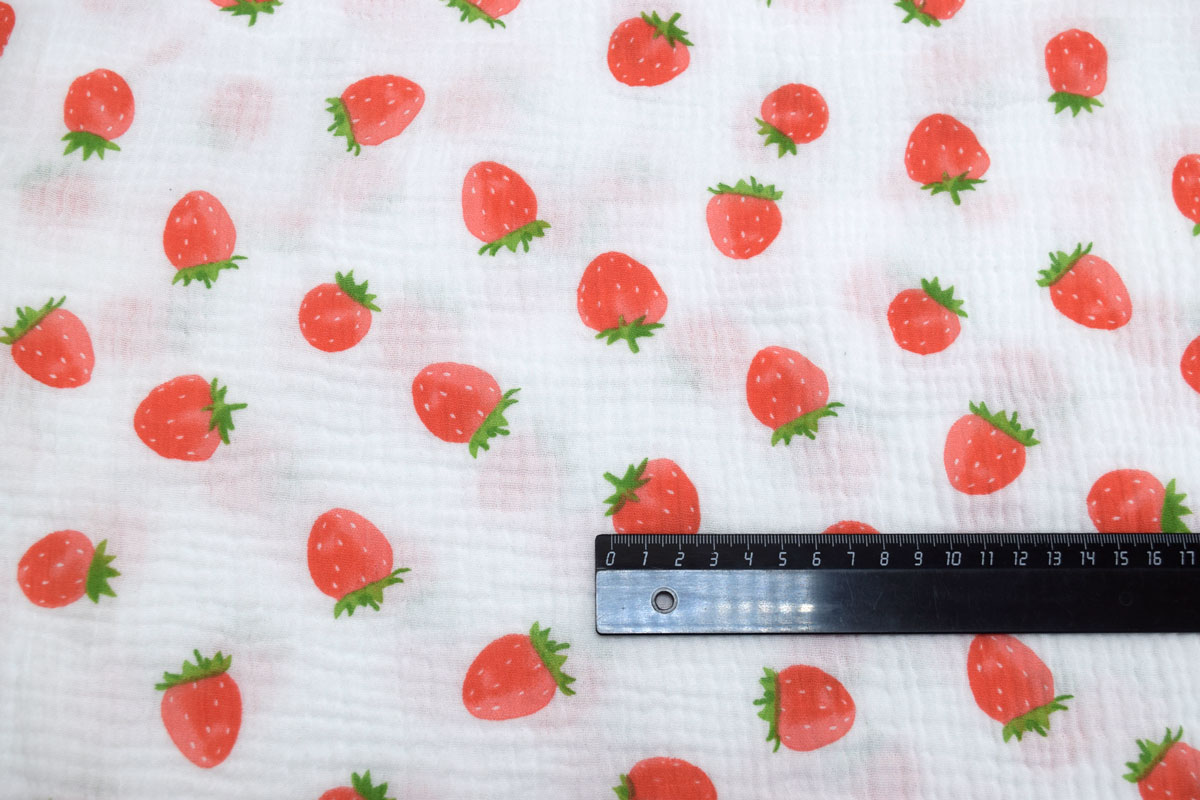 Благодаря плотности 120 г/м2 и ширине 135 см ткань удобно кроится, красиво струится и создает элегантный силуэт, подчеркивая женственность изделий. Белый цвет и Ягоды рисунок позволяют создавать стильные и актуальные модели для повседневного и делового гардероба.